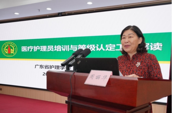 随后广东省护理学会副理事长周丽华作《医疗护理员培训与等级认定工作解读》宣讲,指出“规范培训、持证上岗”是行业发展的必然趋势,鼓励学员珍惜机会,从“新手”成长为“能手”,成为行业信赖的职业技能型人才。