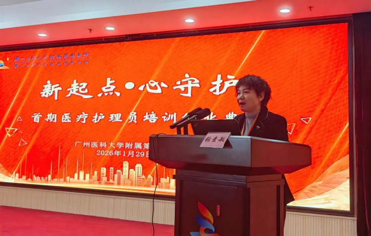 2026年1月29日,广医五院举办首期医疗护理员培训结业典礼,医院副院长余冬冬,护理部负责人周瑛、副主任(医疗护理员培训基地负责人)张素敏及护士长与全体结业学员、第二期学员共同参加。