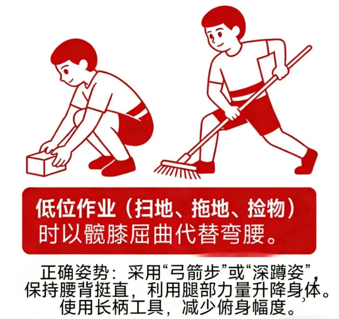 正确姿势:采用“弓箭步”或“深蹲姿”,保持腰背挺直,利用腿部力量升降身体。使用长柄工具,减少俯身幅度。