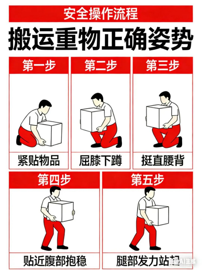 搬运重物动用全身力量,遵循“三贴”原则。