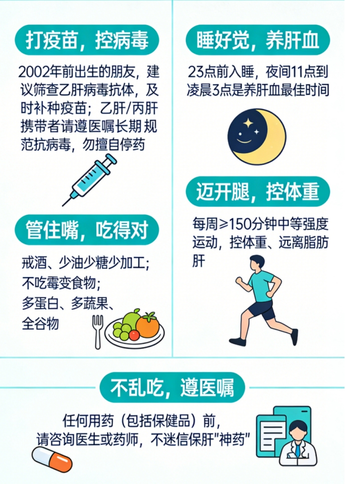 5.不乱吃,遵医嘱:任何用药(包括保健品)前,请咨询医生或药师,不迷信各类保肝“神药”。