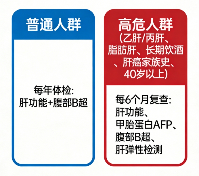 高危人群(乙肝/丙肝、脂肪肝、长期饮酒、肝癌家族史、40岁以上):每6个月复查肝功能、甲胎蛋白AFP、腹部B超、肝弹性检测,把风险拦在早期。