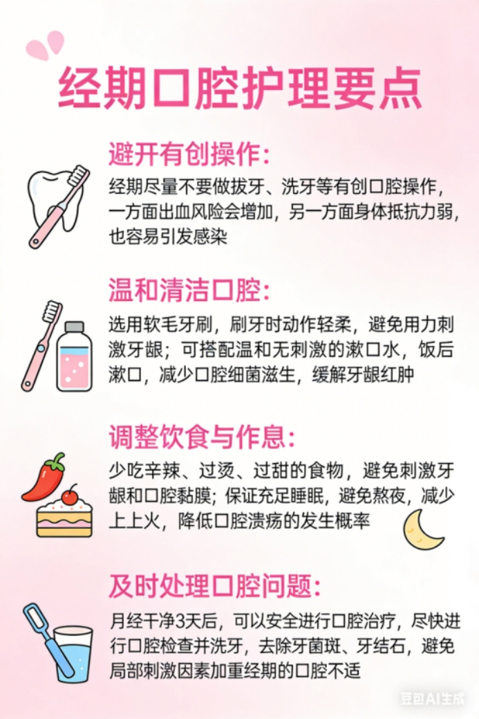 1. 避开有创操作:经期尽量不要做拔牙、洗牙等有创口腔操作,一方面出血风险会增加,另一方面身体抵抗力弱,也容易引发感染。