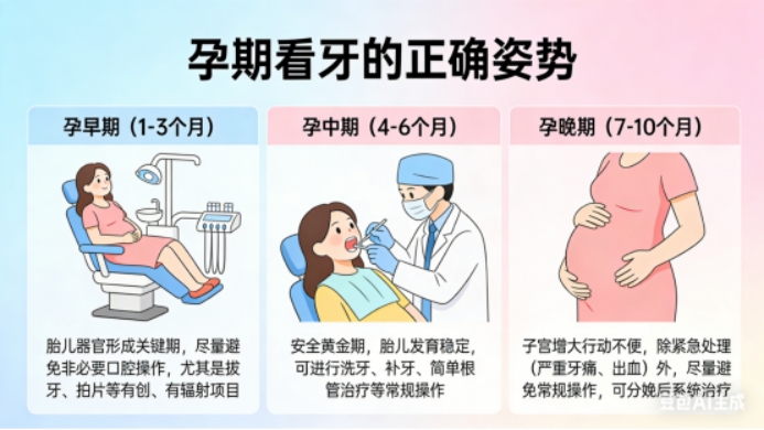 · 孕早期(1-3个月):胎儿器官形成关键期,尽量避免一切非必要的口腔操作,尤其是拔牙、拍片等有创、有辐射的项目,减少对胎儿的潜在影响。