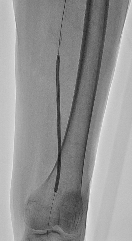 术中李龙虎主任结合造影结果,实施了手术:开通左股浅动脉改善大腿血流,开通左胫前动脉改善小腿及足部血流。送入JR4.0 导引导管,泥鳅导丝多次尝试下可通过股浅动脉远段闭塞病变并送至胫前动脉闭塞病变前,交换V18导丝,先以5.0*150mm外周PTA Catheter扩张股浅动脉中远段病变(图3),复查造影见股浅动脉中远段病变残余狭窄明显改善,再多次尝试下V18导丝可通过胫前动脉闭塞病变至其远段,再送入3.0*150mm外周PTA Catheter由远及近预扩张胫前动脉(图4),复查造影示胫前动脉残余狭窄改善,再送2.530mm药物洗脱外周球囊至胫前动脉扩张释放药物(6atm180s), 复查造影示胫前动脉无明显残余狭窄(图5),血管无穿孔、夹层,远段血运良好。再送5.0*150mm外周PTA Catheter充分扩张股浅动脉中远段病变,再于股浅动脉中远段病变由远及近串联植入支架,复查造影示支架贴壁良好(图6),血管无穿孔、夹层,远段血运良好。术毕,退出鞘管,以血管缝合器缝合穿刺口,无菌方纱包扎,安返病房,术程顺利,病人无不适。术后左下肢足背动脉搏动良好,左下肢疼痛消失,无间歇性跛行。