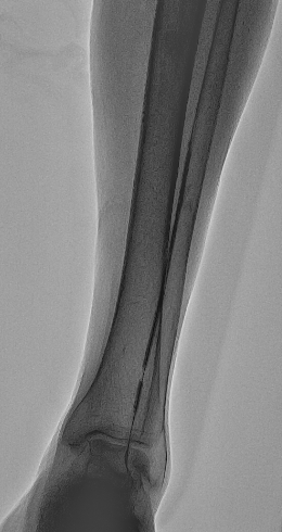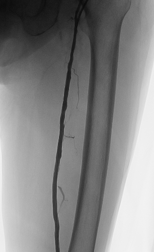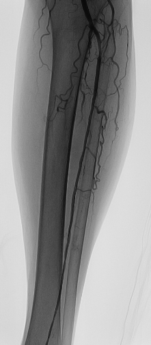 周奶奶被送入介入室,左下肢动脉造影结果证实了术前的判断:左股浅动脉中远段完全闭塞,并可见明显钙化影,同时左胫前动脉、左胫后动脉等多处血管也存在闭塞或严重狭窄。