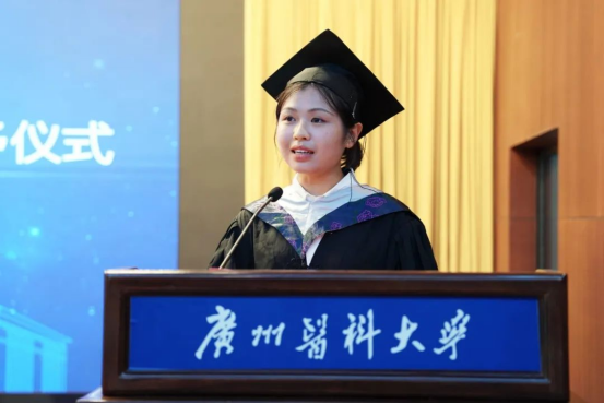 康复治疗学专业曾洁同学作为毕业生代表发言,她分享了四年来自己在广医体验的逐梦的辛苦、收获的喜悦以及成长的蜕变,代表五院全体毕业生对各位辛勤培育学生的领导和老师致以崇高的敬意和衷心的感谢。