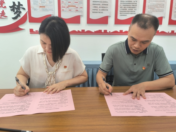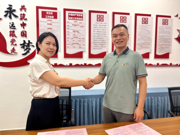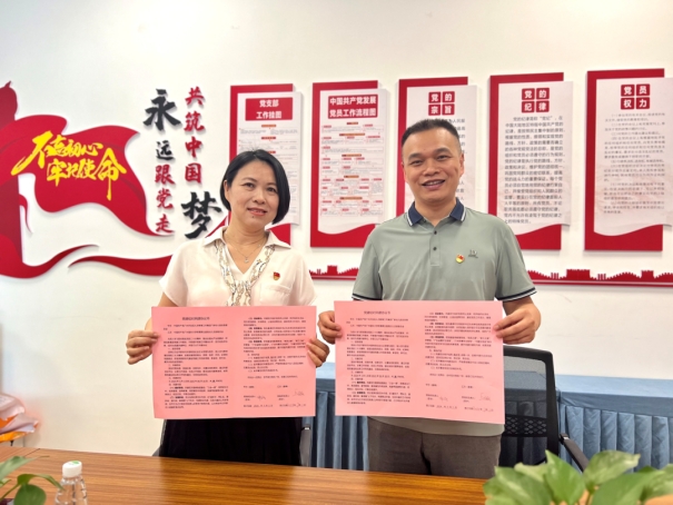 ▲广医五院妇儿党支部书记丘峻朝与广新幼儿园党支部书记薛玲进行支部共建签约仪式。