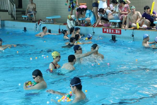 在团体项目中各部门工会派出各自的游泳健将参加比赛,各队队员齐心协力、各施其技忘情地投入到比赛中。“水中夹球”引发了全场的高潮,听得裁判员一声号令,只见负责收集和捞球的队员立即跃进水中向泳池中心堆放的乒乓球游去,尽量收集最多的球,然后小心翼翼地向自己部门工会的终点处游去,而负责在岸边夹球的队员则使出浑身解数把运来的乒乓球夹到岸上的盆里,这一项目的比赛最考的是团队的合作精神,最终第四部门工会以102分的成绩拿到“水中夹球”项目的第一名。“水中拔河”由第一部门工会获得第一名,“运球接力赛”由第八部门工会获得第一名。
