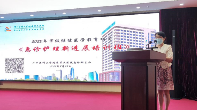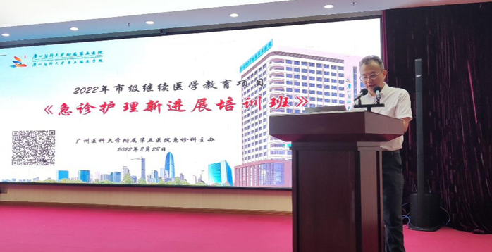 广医五院作为广州市区域急救医疗中心(东片区),为了进一步加强医护急救配合能力,提升广州东部护理人员的综合急救水平,提高抢救成功率,更好服务于人民健康,2022年8月28日,广州医科大学附属第五医院(下称广医五院)护理部主办、急诊医学科承办2022年《急诊护理新进展培训班》,本次会议以线上+线下结合的方式相结合,总参会学员达300余人。