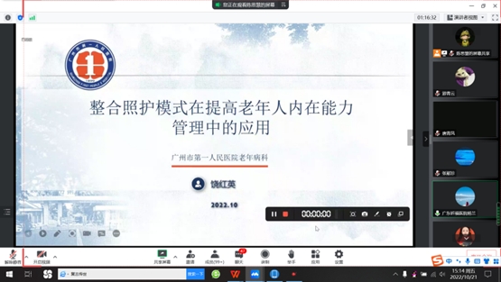 饶红英副主委作为老牌三甲医院的老年病科护长,关于慢病管理与延续性护理有着丰富的实践经验,她分享了《整合照护模式在提高老年人内在能力中的应用》,介绍了她多年来在社区老年人整合照顾方面的成功经验。让学员再次充分认识到:运用科学的管理方法,能够获得事半功倍的效果。