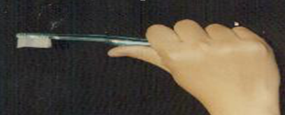 1、牙刷握法:拇指前伸(呈一级棒手势)。