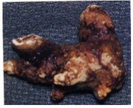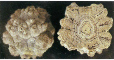 草酸钙结石:呈褐色或深褐色,质地较硬,较小的草酸钙结石表面有多个隆起,如星芒状,较大的如桑葚状;
