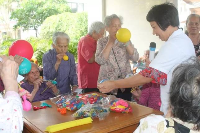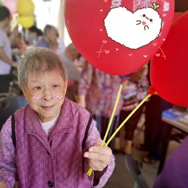 本次活动中,吞咽团队精心准备了一个与吞咽相关的小游戏——吹气球。刚开始活动时,老人们还有点迟疑,觉得自己年纪太大不够气,没办法参加。但是在治疗师们的耐心鼓励下,最终鼓起勇气,也都成功的将气球吹起来了。