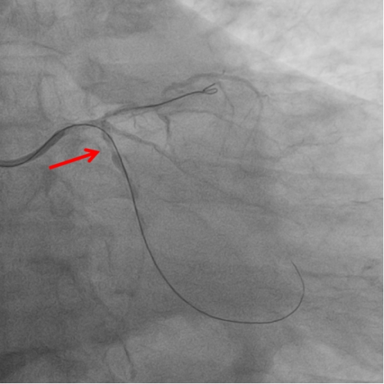 李主任在台上问患者还能否耐受手术,可以的话,争取半小时内尝试开通前降支慢性闭塞病变,患者感觉气促好多了,说“还能再躺一会儿”,在患者的积极配合下,李主任应用双导丝技术很快通过慢性闭塞段,充分扩张病变段后予药物球囊处理。