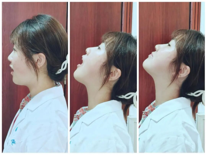 牵伸前侧颈阔肌,头保持在正中位,张开嘴巴,仰头后闭上嘴巴,保持30s,每次3-5组;