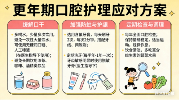 · 口干舌燥(最常见):雌激素下降会导致唾液分泌减少,口腔缺乏足够的唾液滋润,会出现口干、口苦、口臭等问题;而唾液是口腔的“天然保护屏障”,能抑制细菌滋生、中和胃酸、保护牙釉质,唾液减少会让蛀牙、牙周病的发生率大幅上升。