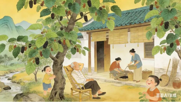 “维桑与梓,必恭敬止“,意思是桑树和梓树是父母长辈亲手栽种,留给子孙后代享用的,见到“桑梓”,就如同见到父母般要恭恭敬敬。桑梓自古常代指故乡,如今这一词已成为中华文化中表达乡土情结的重要符号。“造福桑梓”“反哺桑梓”这些成语,都表达了为家乡做贡献的美好情感。了解了这层文化渊源,再看看我们手中的这颗紫色小果,是不是更添几份亲切和敬意?