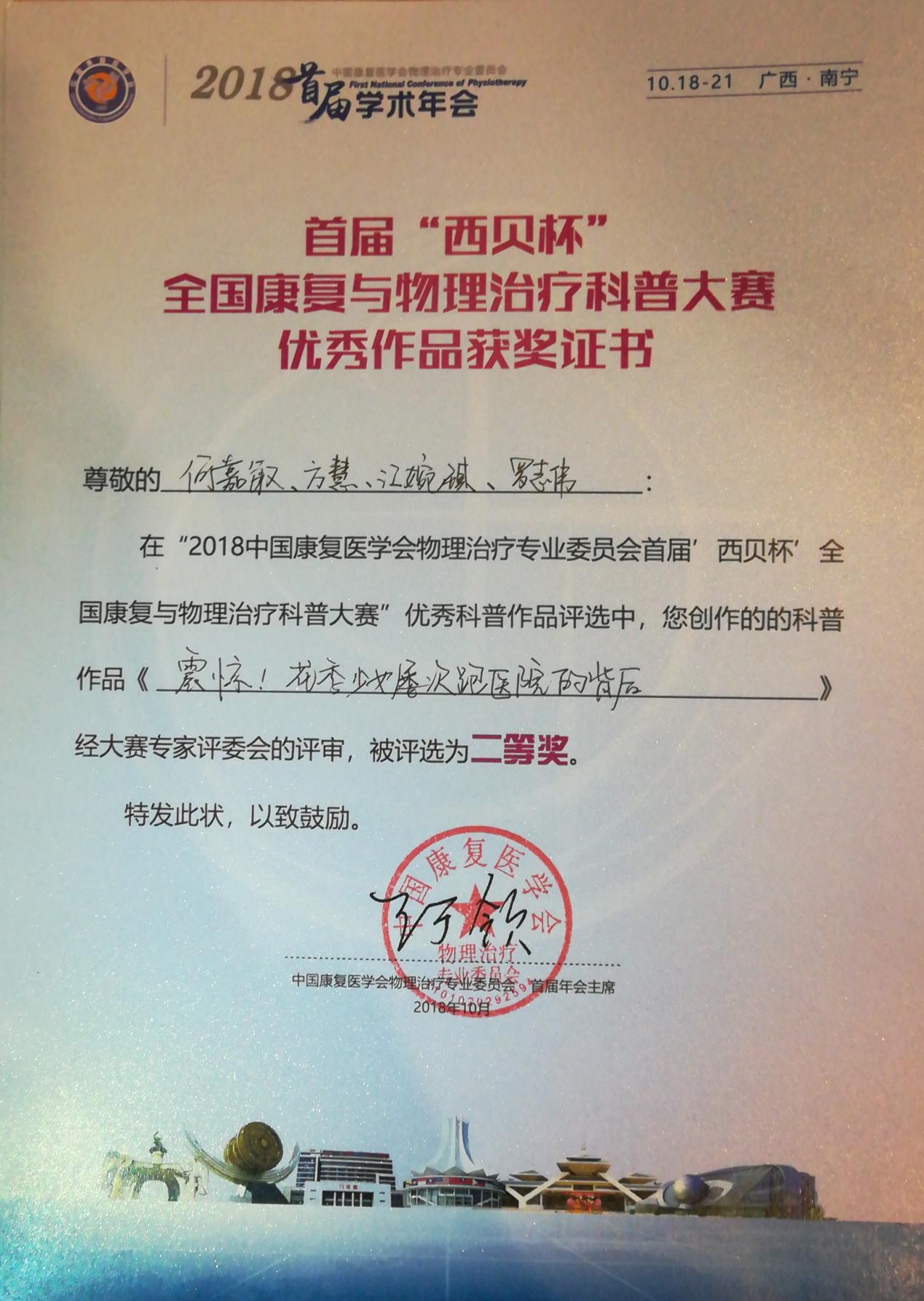 在第五临床学院康复教研室江婉琪、罗志伟老师的带领下,2016级康复治疗学专业(OT方向)学生何嘉敏、方慧参加2018年首届“西贝杯”全国康复与物理治疗科普大赛,斩获二等奖。