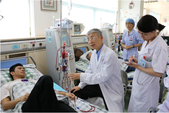 当天上午,在我院肾内科医护人员的陪同下,罗教授对肾内科疑难病例进行了教学查房,围绕透析病人的个体化治疗等热点问题提出了独到见解并分享了宝贵经验。俯身体查,坐下倾听,这些都是罗大伟教授对查房的基本要求。他通过列举一些简单的生活道理来为患者解释医学依据,如为了让患者理解肾脏功能,他将我们的肾脏功能比作10个手指,一个手指代表10分,随着年龄的增长,肾脏功能会逐渐减退,当我们到40 多岁时,肾功能自然衰减。此后每年减少一分,到六十岁时,正常人也只能80分,所以我们要好好保护我们的肾脏,这种贴近生活的讲解方式得到患者一致的好评。现场既是一次查房,又像是一次远道而来的聚会。