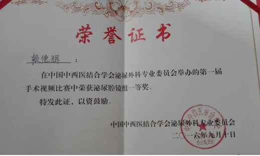 此次会议同时举行了第一届中国中西医结合学会泌尿外科专业委员会手术视频大赛,大赛云集了全国32家泌尿外科中心的32位青年才俊,就各家所长,分为腔内组和腹腔镜组进行每人7分钟的手术视频展示和讲解,3分钟问答。我院赖德辉博士代表泌尿外科参加比赛,幽默诙谐的表达,创新手术方式的展示,和灵动的答辩,得到评委的一致好评,获得腔镜组一等奖。