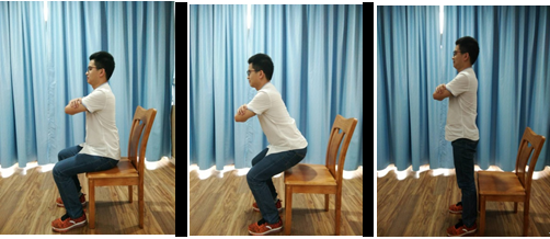 3.30秒坐起测试,测试反应功能性下肢力量。老人坐在一张高约1000px的凳子上,以尽量快的速度站起来,再坐下,30秒内看能做多少次。