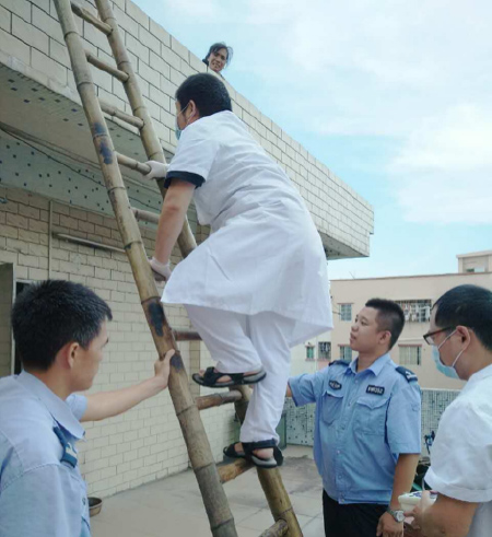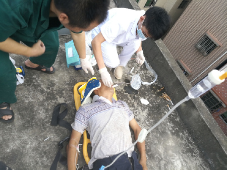 当救护车赶到现场时,复杂的情况让大家吃了一惊。原来是一个正在7楼顶楼施工的工人,不慎跌落隔壁6楼楼顶天台;恰巧房子的屋主外出,施救人员很难去到事发现场。受伤的工人最初的意识尚清楚,当救护人员赶到现场的时候,他的病情已出现恶化,意识开始模糊,生命危在旦夕。在这危急的时刻,在消防人员的帮助下,消防人员破门而入,医护人员赶往伤者所在的楼顶。这时大家发现,通向顶楼的只有一把简陋竹梯,没有多想自己的安危,医护人员沿着左右摇晃的竹梯,依次爬梯上楼,来到施救现场。