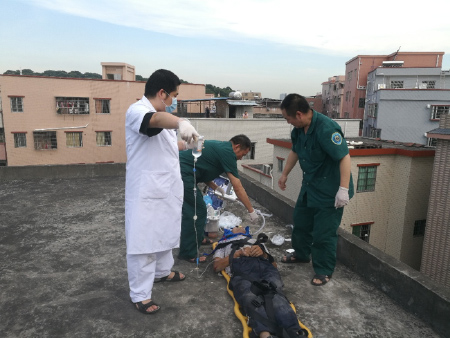 不久前的一个傍晚,广医五院急诊科接到一通120急救电话,有一位高空坠落伤患者,情况危急。当值的皮斌主治医师、黄晨医师、廖鹏辉护士立刻出动,在3分钟内准备就绪并坐上救护车赶往现场。
