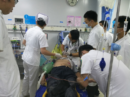 救护车风驰电掣般回到医院,一切早已准备就绪。急诊科张利国副主任立即指挥将患者推入抢救室,维护生命体征,各相关科室医生也赶到抢救室,合同协作,气管插管、深静脉穿刺,开通绿色通道,抢救工作有条不紊的开展。在争分夺秒的检查和抢救下,伤者的基本生命体征得到平稳维护,安全送往科室进行下一步治疗时,急诊科医护人员及相关科室人员疲惫的面孔这才露出了放松的笑容。