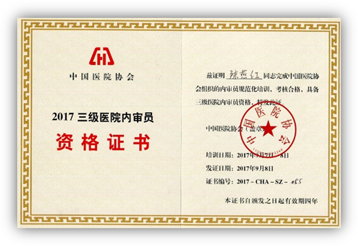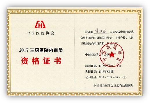 培训班课程完毕后,我院全体培训人员均参加协会组织的集中考核,并取得2017年三级医院内审员资格证书。大家表示此次培训对医院的三甲创建、自查自改等工作具有重要的指导意义,通过专家的讲解授课收获颇丰,能深入了解内审员体系建设的重点难点,能切实解决医院内审工作面临的困难与问题。