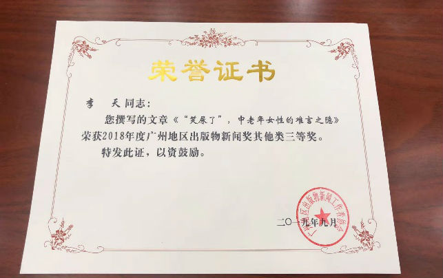 会上,我院泌尿外科二区李天主任荣获科普类优秀通讯员奖,同时由他撰写的《“笑尿了”,中老年女性的难言之隐》荣获2018年度广州地区出版物新闻奖其他类三等奖。