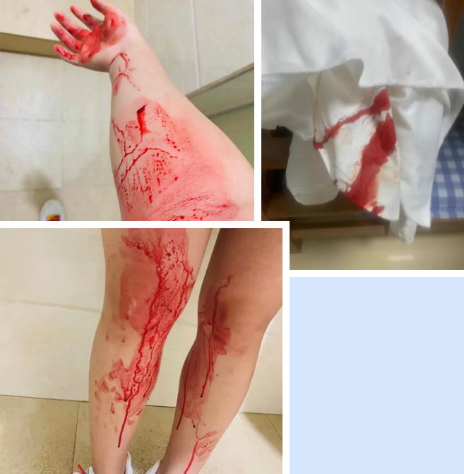 浑身“浴血”的王美华让李祝婵吓了一跳,得知了现场的情况后,她也加入了急救的行列中。由于事发地距离我院仅几百米的距离,判断伤者可以移动后,两人帮助伤者来到我院接受进一步治疗。在前来的路上,伤者头部的血也渐渐止住。