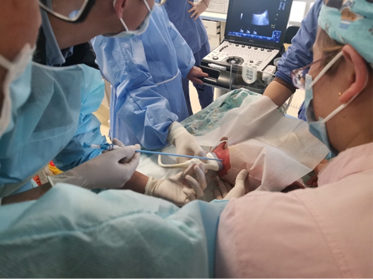 为尽快解救宝宝在妈妈子宫内就开始受压的肾脏,经过慎重的术前讨论与准备,我院新生儿科立刻联系泌尿外科何永忠主任、超声科值班医生进行多学科会诊,在宝宝入院后第二天,也就是元旦假期的第二天,由何永忠主任主刀,紧急为宝宝进行了超声引导下经皮肾穿刺引流术。