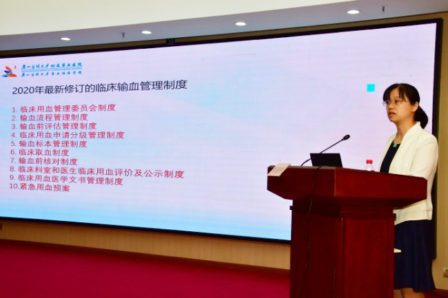 会上,输血科黄爱群副主任就临床输血管理制度、输血相关法律法规、控制输血严重危害(SHOT)方案、紧急用血预案和紧急抢救配合性输血、非同型输注管理制度四个方面进行展开,并对临床输血常见问题提出相应的改正意见。