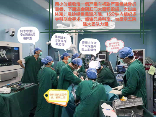 一切以救人为重,医院马上开通绿色通道,骨关节外科陈为坚主任紧急联系医务科,十五分钟内医院骨科、普通外科、妇科、泌尿外科、麻醉科、手术室等多科专家集结完毕并共同会诊,为女孩拟定了一个周全的个性化治疗方案,并通力合作,全力投入抢救工作。仅仅十分钟,小刘就直接从急诊抢救室送入手术室抢救。