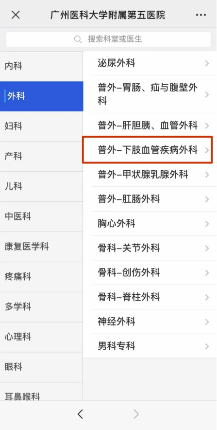 关注“广医五院”微信公众号,依次选择“患者服务-预约挂号-按科室挂号-外科门诊”,选择“普外-下肢血管疾病外科”在线预约。