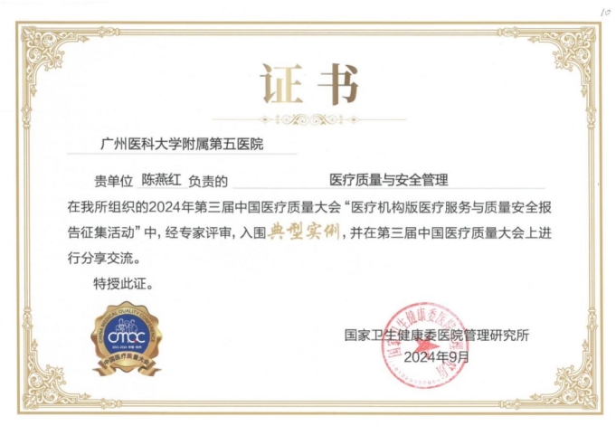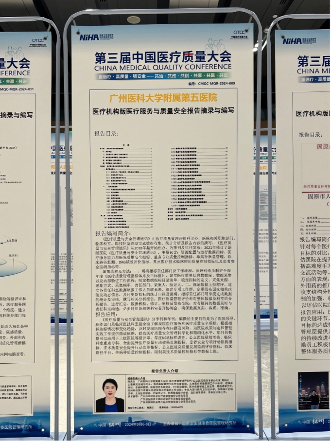 此次大会汇聚了众多医疗界的精英和专家学者,共同探讨和交流医疗质量管理的新理念、新方法和新成就。大会主题为“重医疗、高质量、强安全——共治、共改、共进、共创、共享、共赢”,为推动医疗质量的持续改进和医疗行业的共同发展发挥了积极作用。广医五院质评科牵头编写《医疗质量与安全管理通讯》在国家卫生健康委医院管理研究所组织的2024年第三届中国医疗质量大会“医疗机构版医疗服务与质量安全报告征集活动”中,经专家评审,入围典型实例,并在第三届中国医疗质量大会上进行分享交流。
