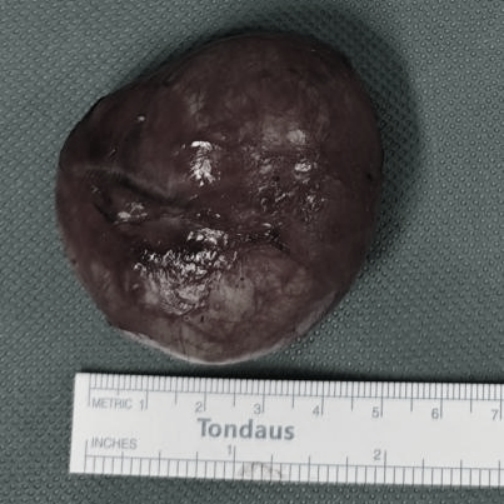 经人推荐,一家人来到广医五院耳鼻咽喉科。科主任张建中主任医师接诊后,经详细检查,确诊小李颏下有一个约54×51×39毫米的皮下囊性包块,需手术切除。