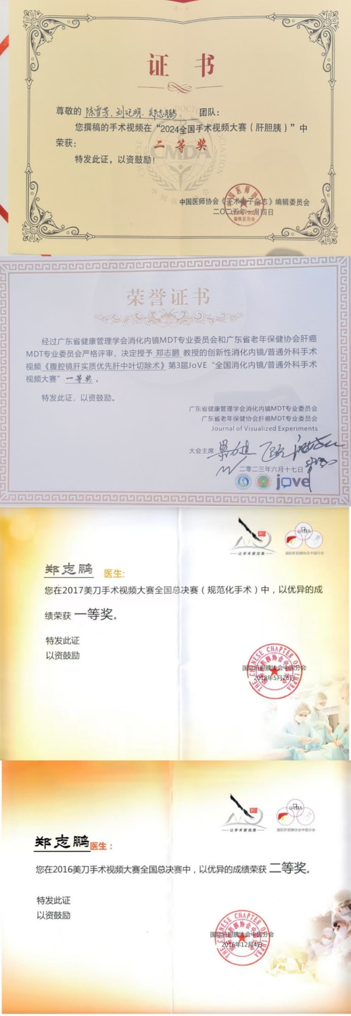 获2025年全国JoVE普通外科手术比赛一等奖、2023年全国JoVE普通外科手术比赛一等奖、2017年国际肝胆胰协会中国分会全国手术比赛冠军、2016年国际肝胆胰协会中国分会全国手术比赛二等奖;第七届“南粤好医生”、第九届“羊城好医生”等荣誉。
