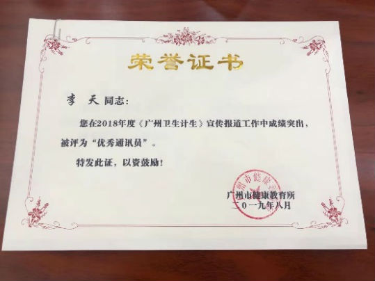 2019-11-06喜讯!泌尿外科李天主任荣获2018年度《广州卫生计生》优秀通讯员奖
