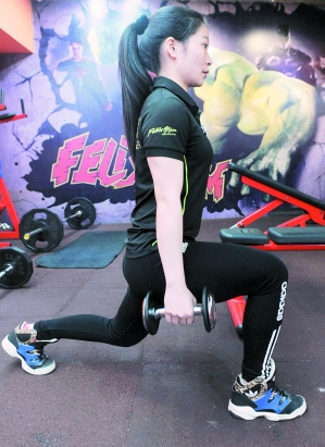 动作:两手持哑铃,两脚自然开立,右脚向前跨出一步,屈膝,后腿膝盖接近地面,成箭步蹲。一腿完成一定次数后换另一腿前跨做。
