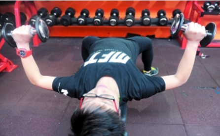 动作:两手持哑铃仰卧凳上,哑铃置于肩部上方,掌心朝上,上推哑铃至臂伸直,稍停,然后缓慢还原。