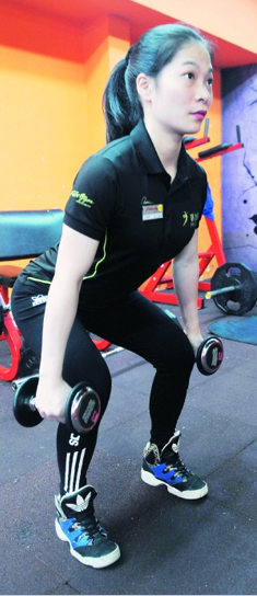 动作:双手各持哑铃于体侧,控制稳,两脚自然开立约与肩同宽,脚微呈八字形,挺胸,腰背收紧。屈膝下蹲至最低位,然后大腿用力收缩蹲起还原。