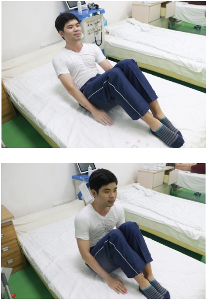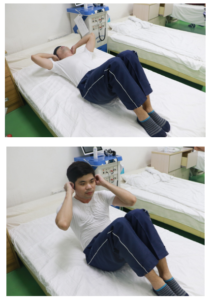 侧重下腹部及大腿前方肌肉锻炼的仰卧起坐:以坐位开始,后仰不需达到平躺,达到45-50度即可,动作过程中要保持背部挺直,视自身情况可以从2-3个每组开始逐渐增加,每次5-6组。