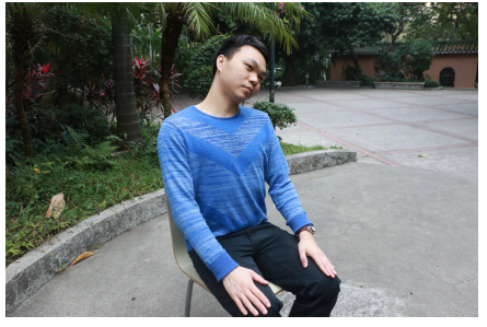 二、头部向后屈,左右有方向做180度的旋转,5个为一组,前屈同样训练,可以前后共4组。这样两组动作可以增加颈椎的活动度,促进血液循环。