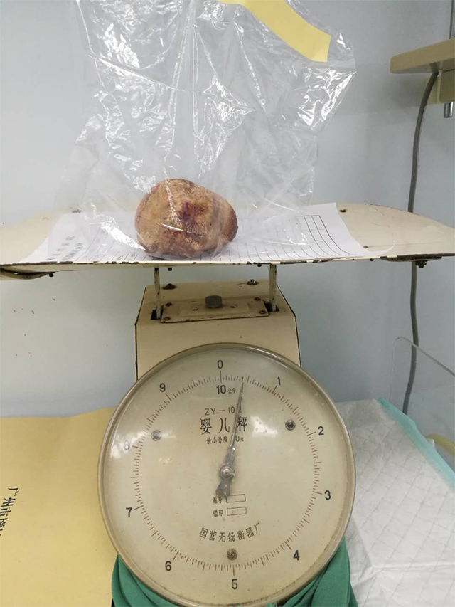 确定手术方案后,在其指导操作下,经过1个多小时的手术,最终成功将患者的巨大膀胱结石取出。一个成年人拳头大小的结石呈现在医生面前,占据了整个膀胱,结石取出后经测量,体积比成人沙钵大的拳头还大,过称竟重达453克。