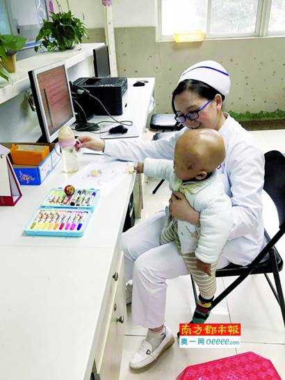 值班护士张惠姣和查完房的肿瘤科余桂芳主任也加入了陪伴小旭的小分队,她们为小旭换尿片、陪着他玩耍、想尽方法驱逐他离开妈妈身边时的焦虑与不安。