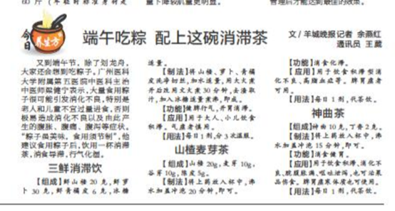 又到端午节,除了划龙舟,大家还会想到吃粽子。广州医科大学附属第五医院中医科主治中医师梁健宁表示,大量食用粽子很可能引发消化不良,特别是老人和儿童不宜过量进食,否则极易造成消化不良以及由此产生的腹胀、腹痛、腹泻等症状。“粽子虽美味,食用须节制”,他建议食用粽子后,饮用一杯消滞茶,消食导滞,行气化湿。