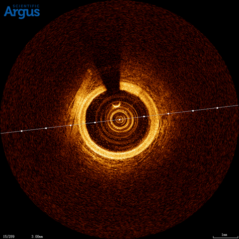 通过OCT检查的造影图像可以精确判断:林叔球囊切割后最狭窄处管腔直径2.57mm,面积5.29mm2,斑块性质以纤维为主,可以选择不植入支架,而是使用药物球囊进行处理。