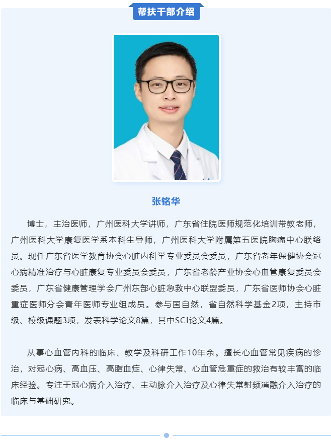 2022年6月,广医五院心脏中心张铭华博士跨越千里山河,来到西秀区人民医院开展医疗帮扶工作,全力推动医院的胸痛中心的建设。在他的努力下,目前医院正在申请国家级胸痛中心认证,同时已已顺利开展急诊PCI手术10余台,救治心血管危重患者20余例。接下来张铭华博士还将带领科室进一步开展更多的新技术,让安顺市老百姓在家门口得到更好的“心”救治。